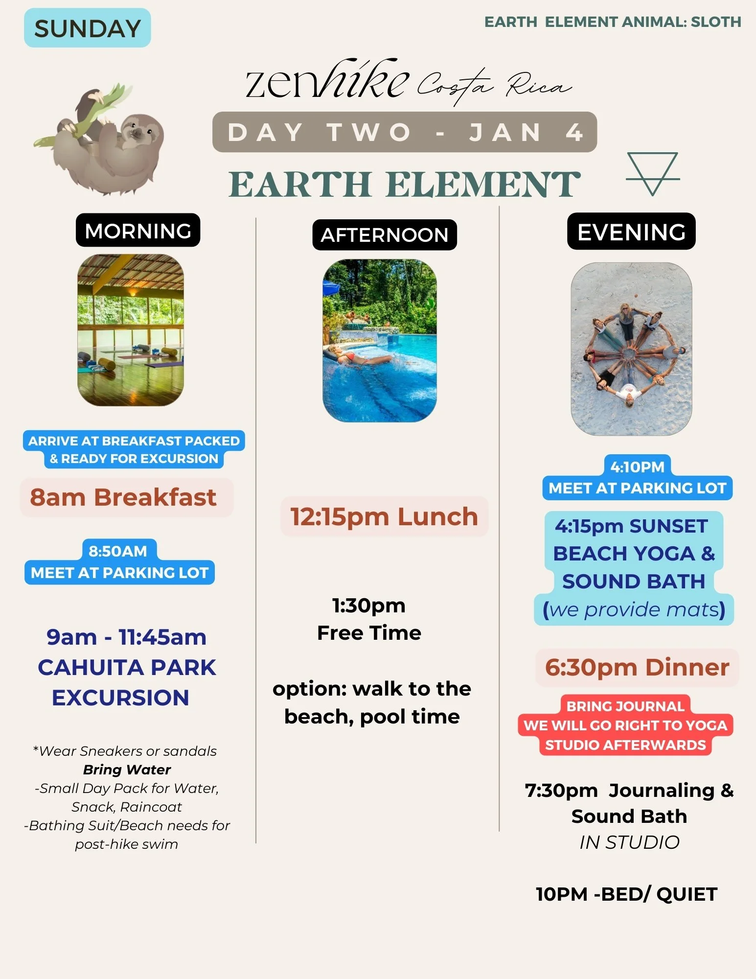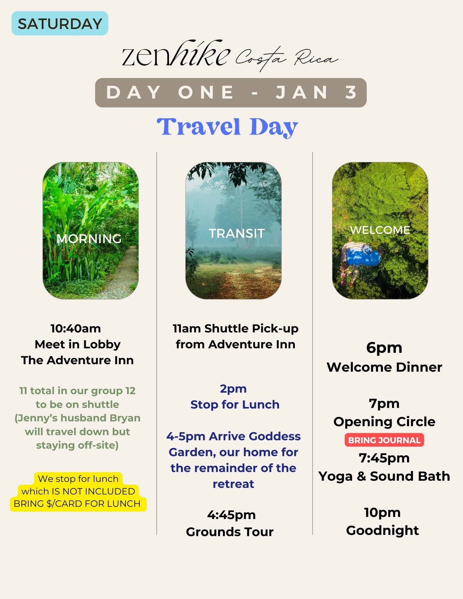 The following morning on January 3rd, our bus/shuttle will pick us all up from Adventure Inn and take us to the Goddess Garden resort in Cahuita (4 hours south).