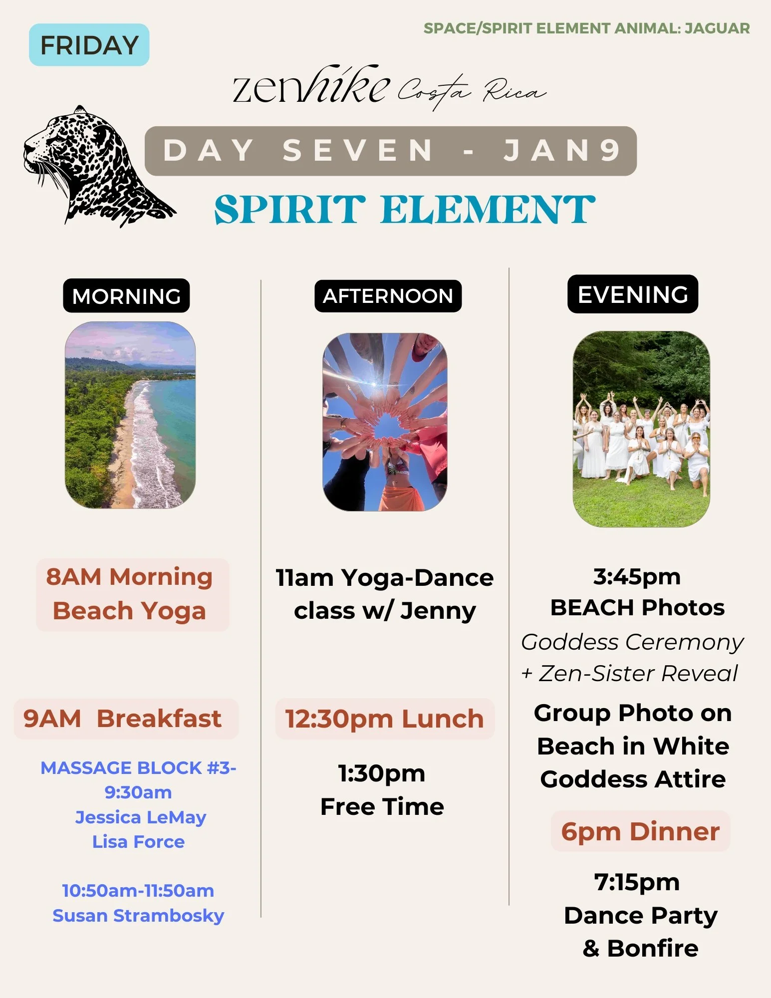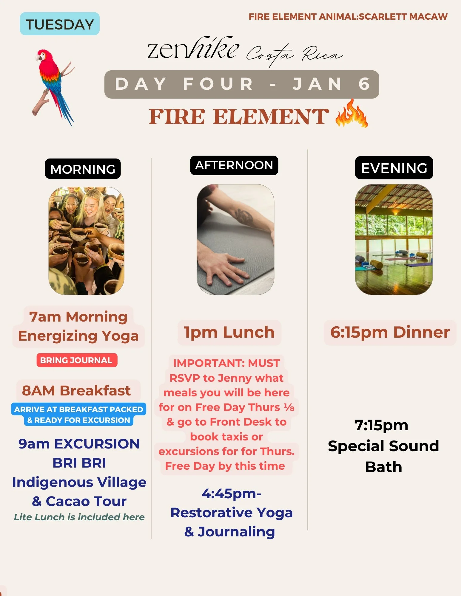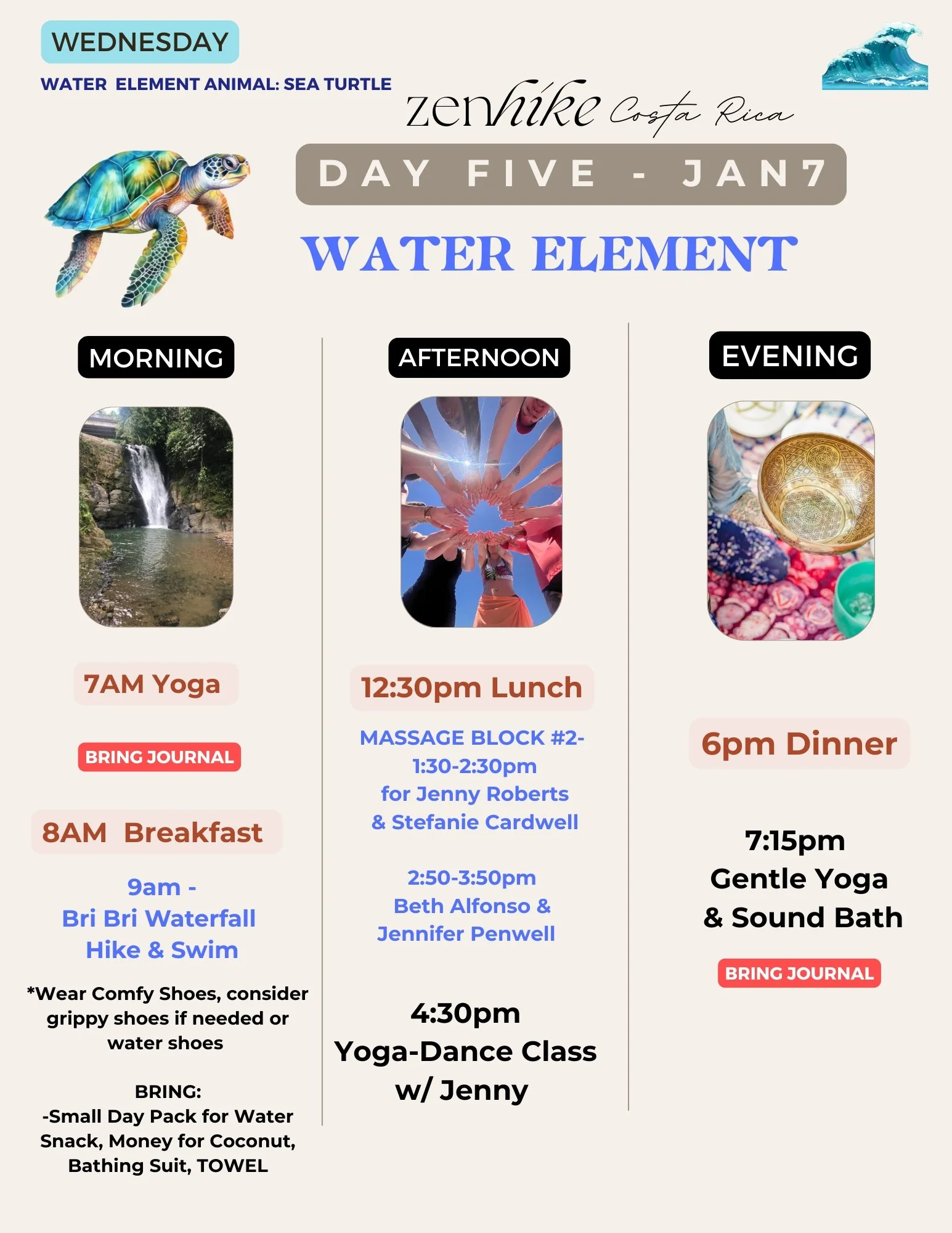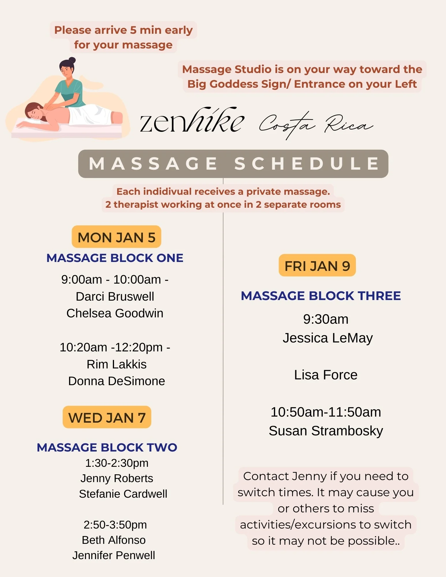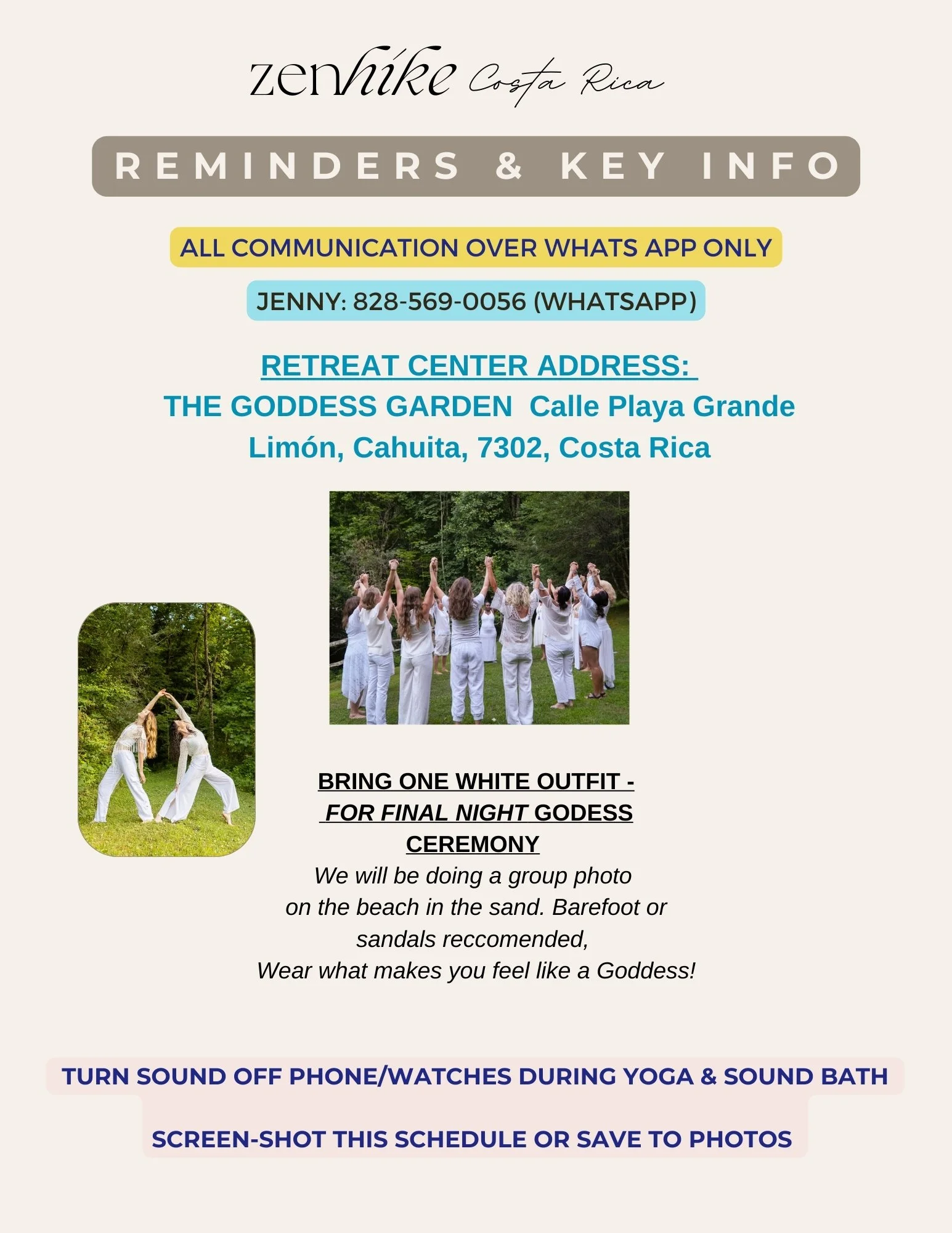 We will need to communicate with each other over What’s App while on retreat. Jenny will be in Costa Rica on Jan 1 so reach out with questions over What’s App vs. typical phone call.
