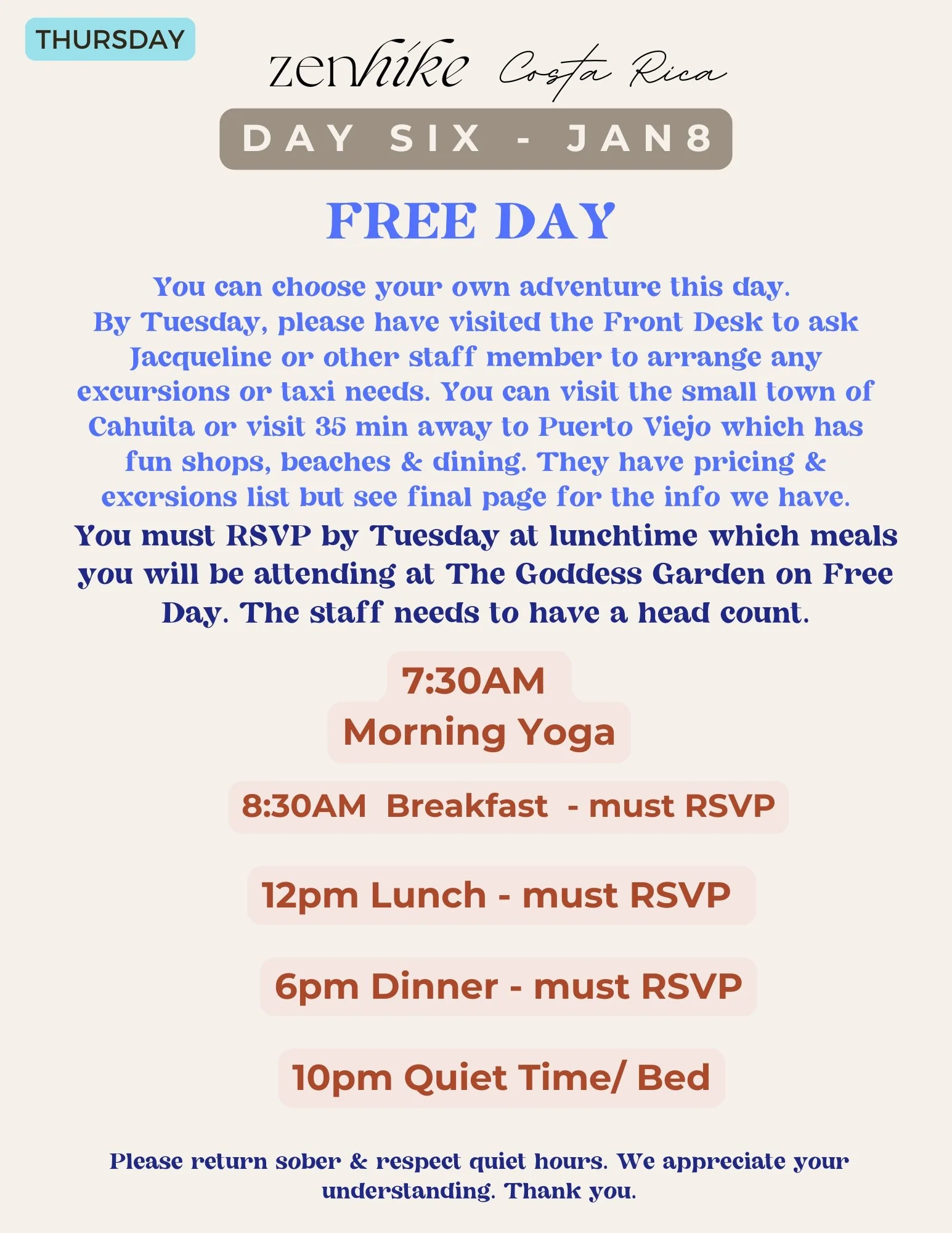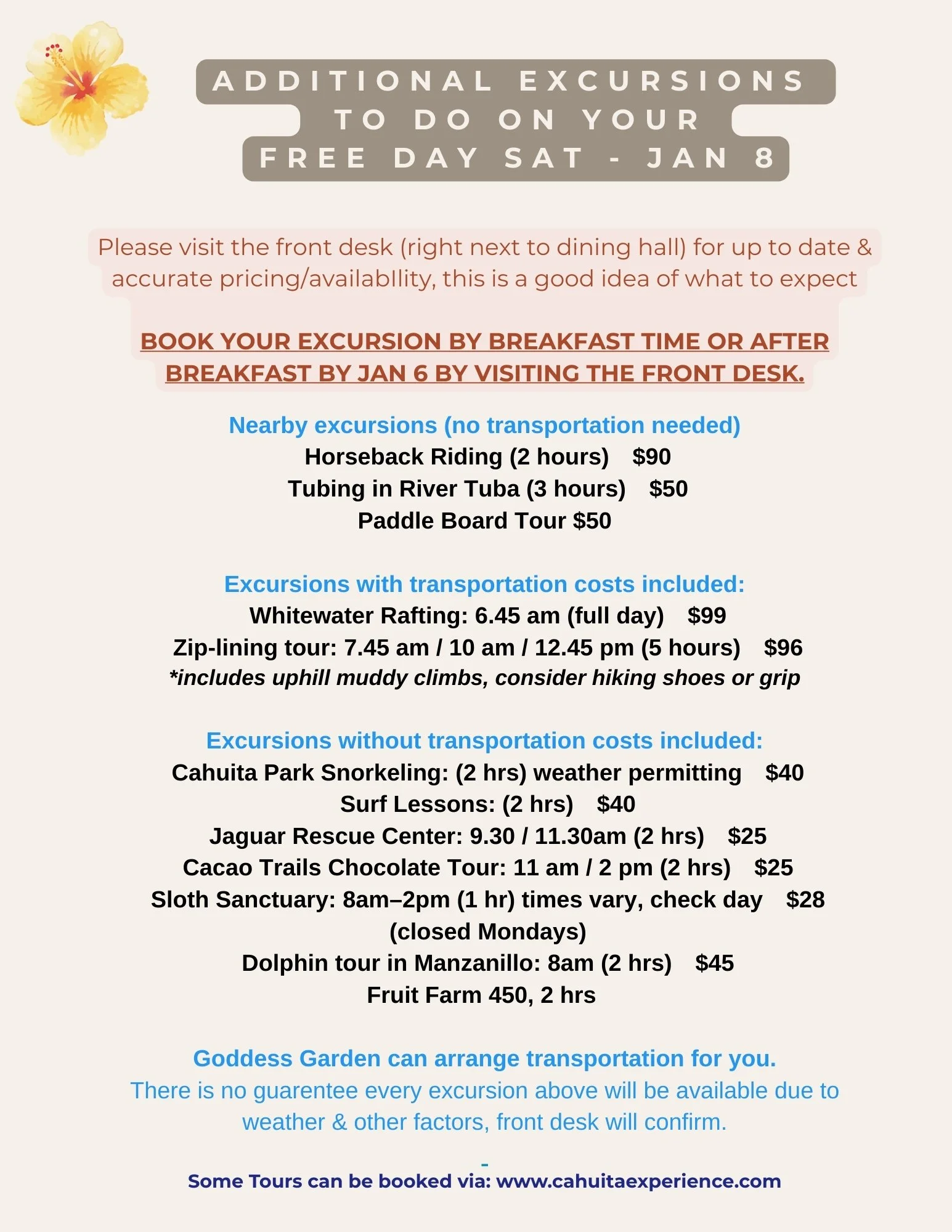 FOOTWEAR: Optional bring Hiking Shoes just for the waterfall hike which will be downhill and possibly muddy. For other hikes sneakers will be just fine. You would be best with hiking shoes for the uphill climbs as well if you plan to go zip-lining, which is NOT a part of our planned excursions this year but you can go on your “free day” if you’d like to book that (please arrange with the front desk upon arrival or website).
